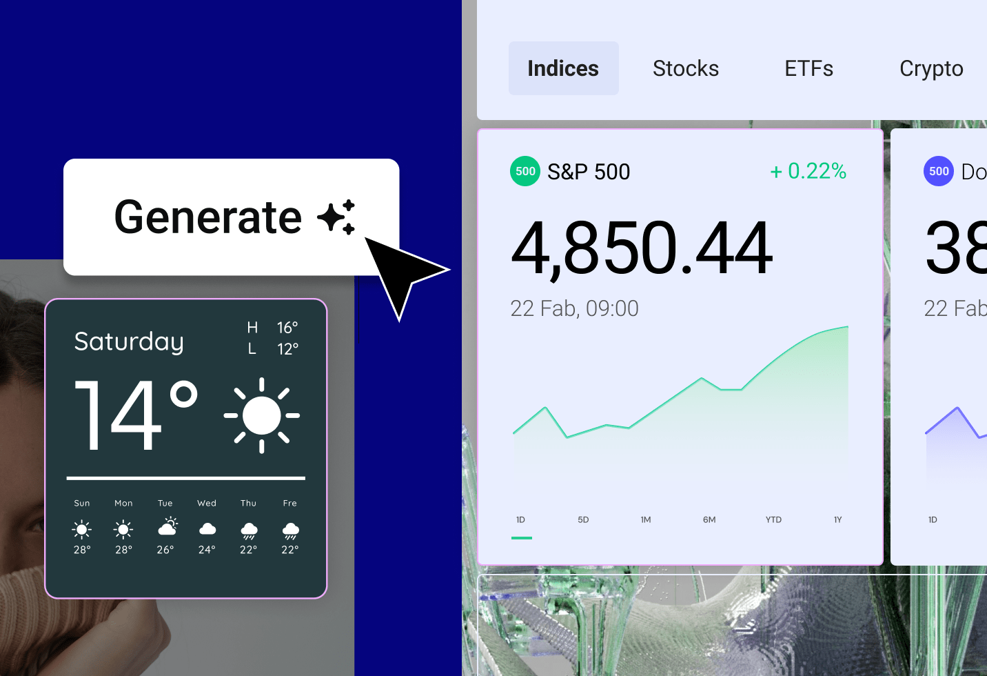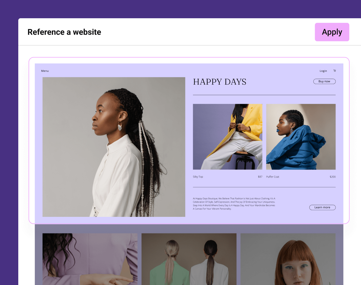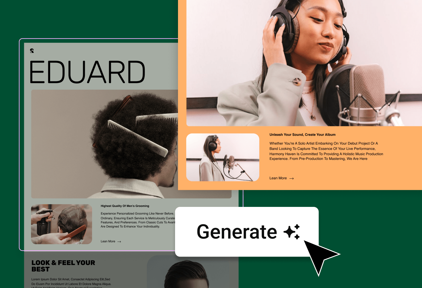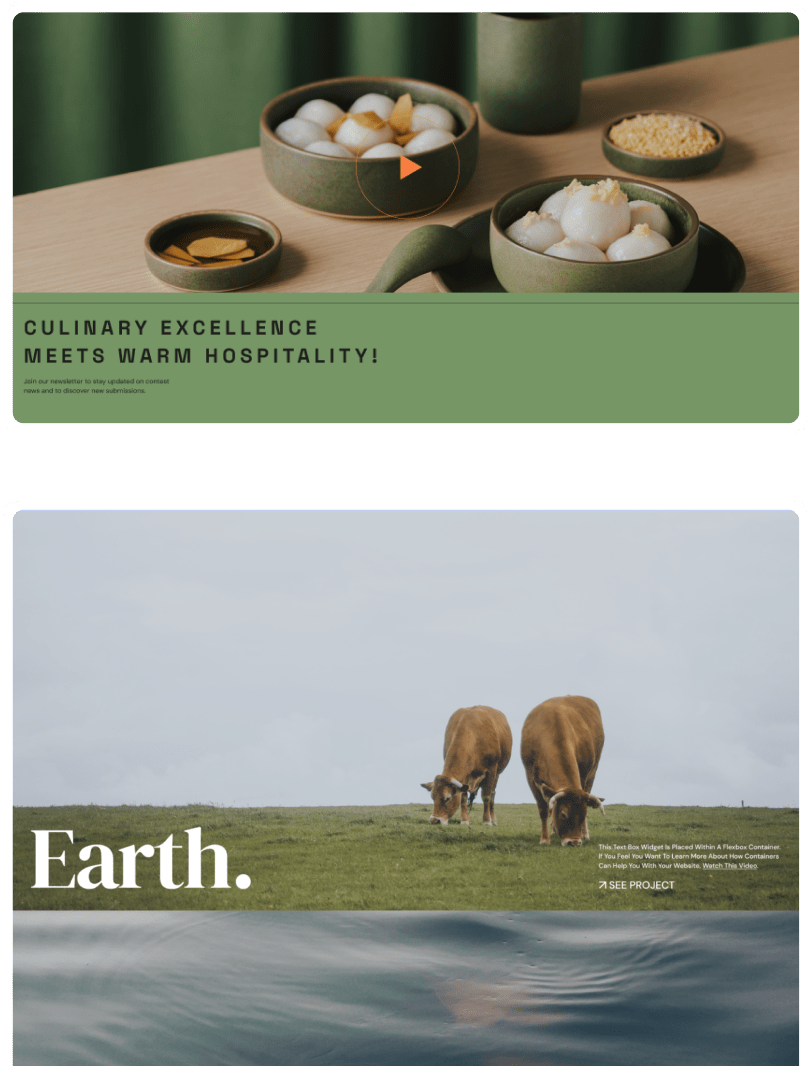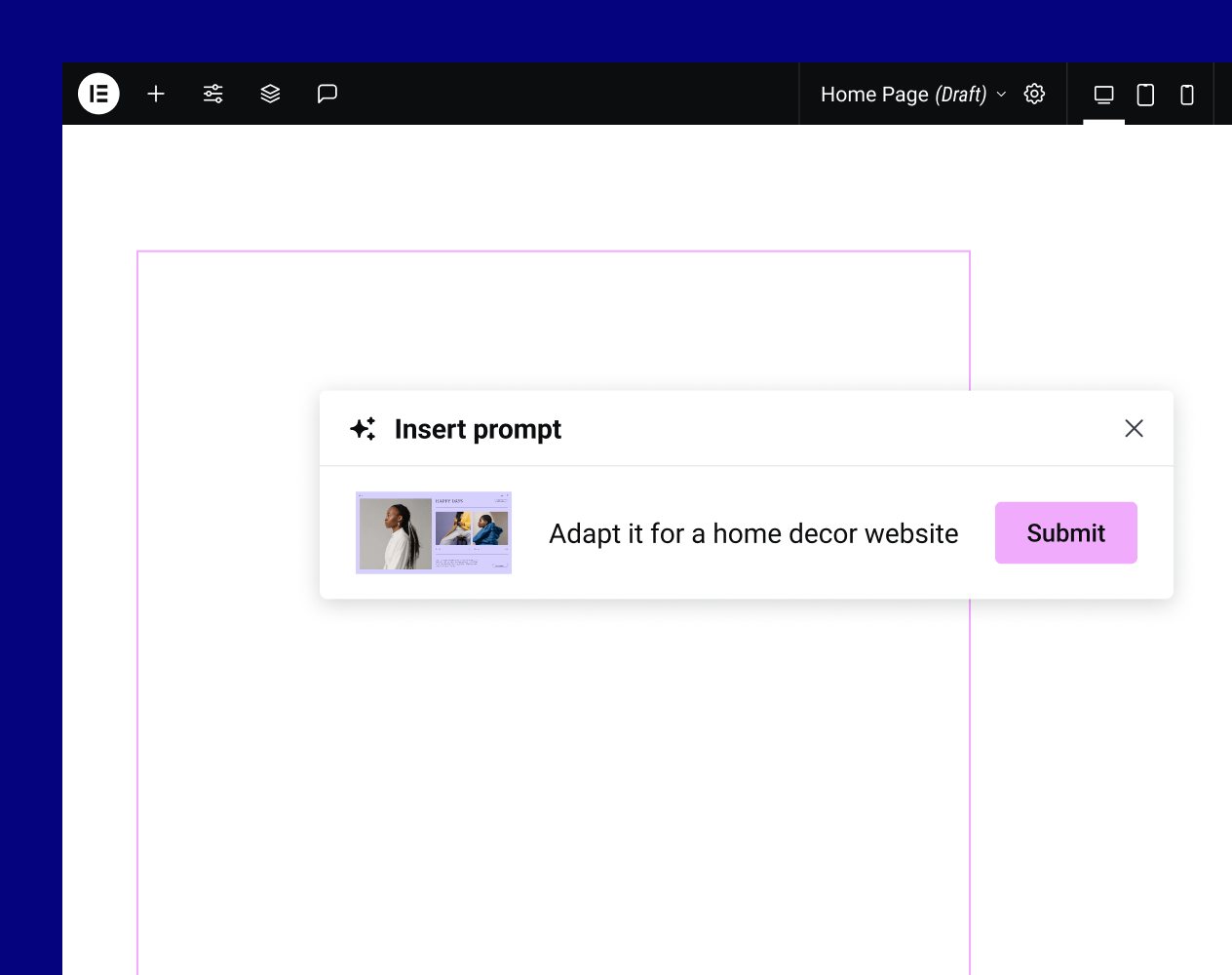 There are many ways to use AI to build a container layout. One way is to write a prompt that describes the structure of what you want. Another, is by referencing a section of any site you find on the web and AI will present you with a wireframe that closely matches your request. AI can then generate fully styled variations based on Elementor designs or you can style with the images, content, fonts, and colors of your choice.