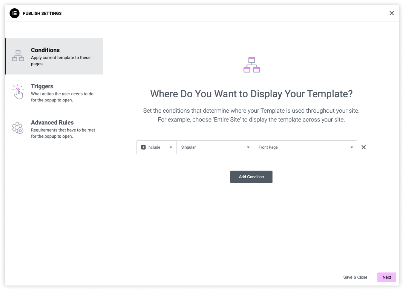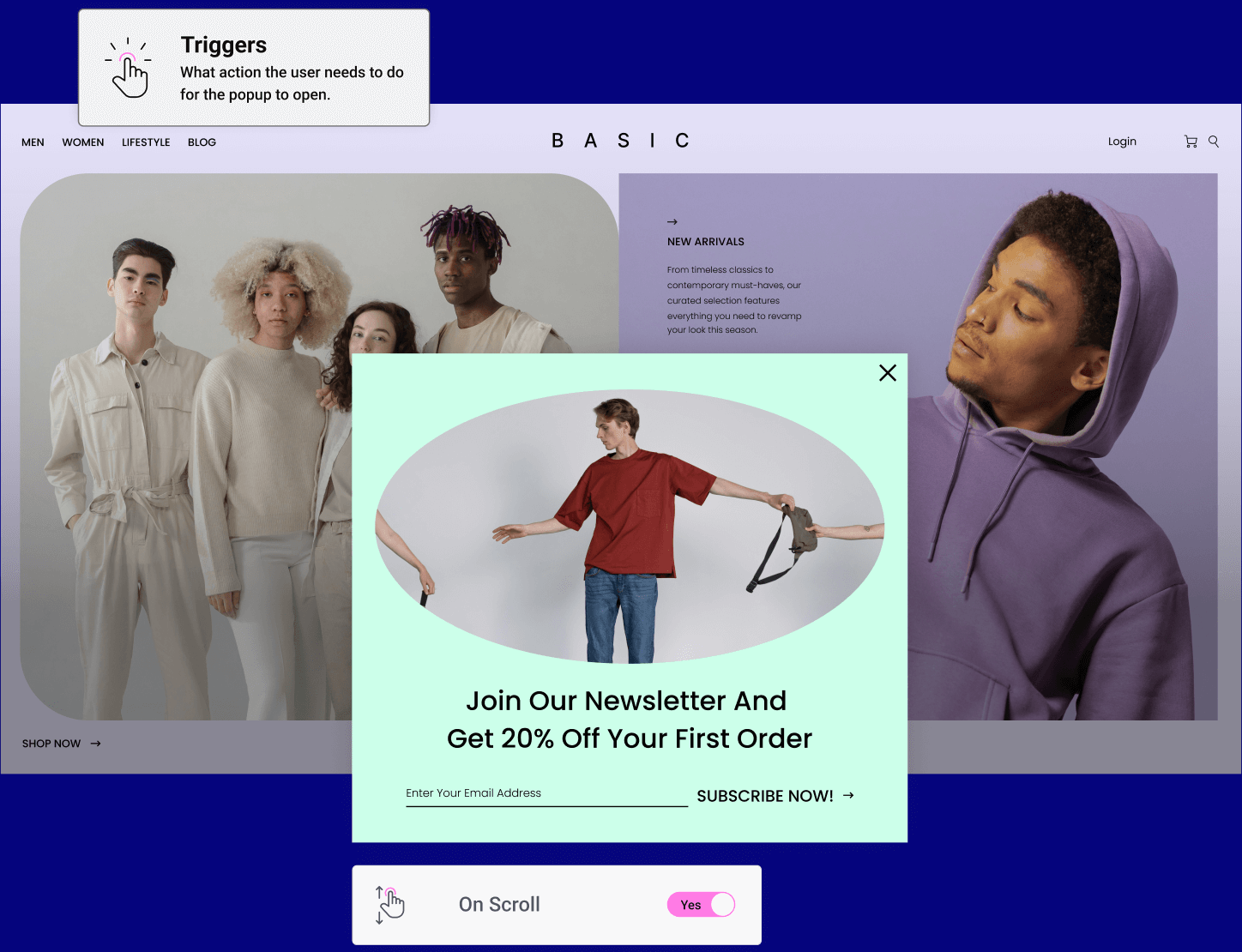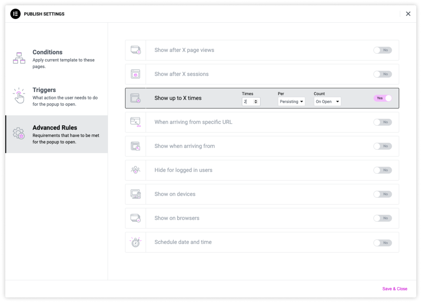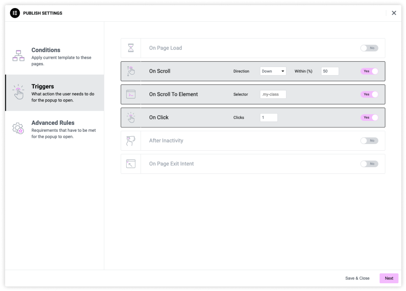 Popup Builder includes page-based, time-based, and device-based targeting as well as those driven by visitor behavior (clicks, scrolling, form submit and more)