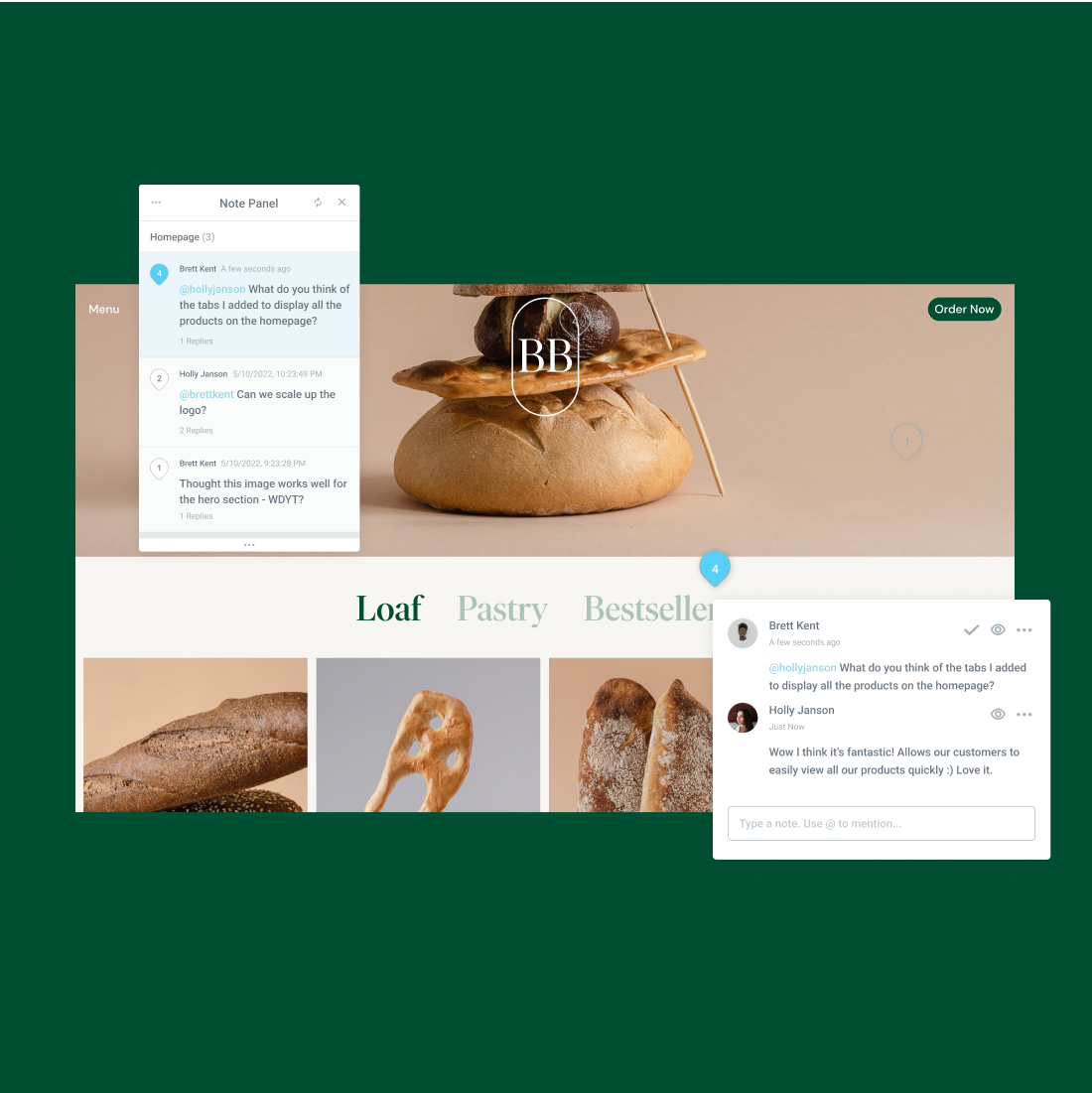 Provide and collect feedback on your website by pinning contextual Notes with comments for your team, clients, or even yourself in the Editor or in the Front End for logged in users.
